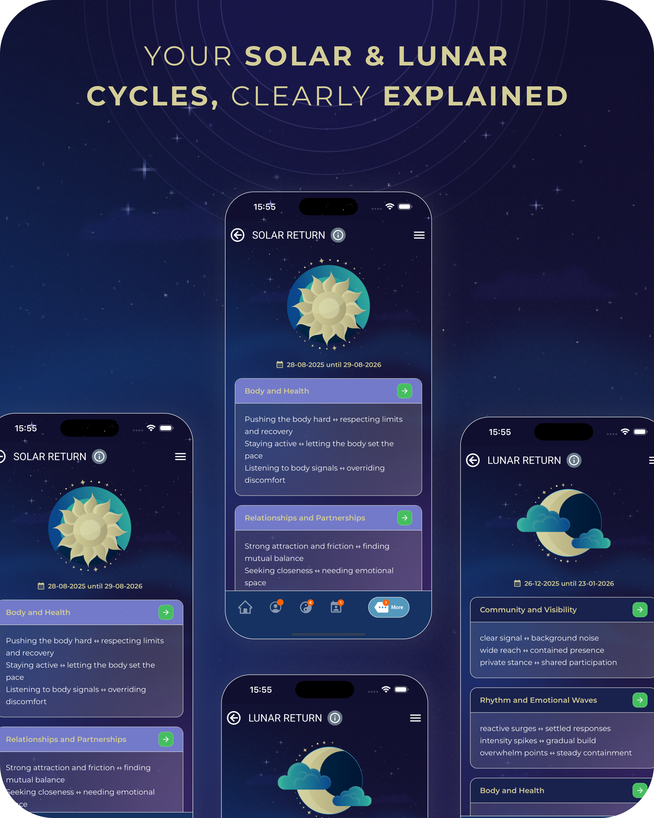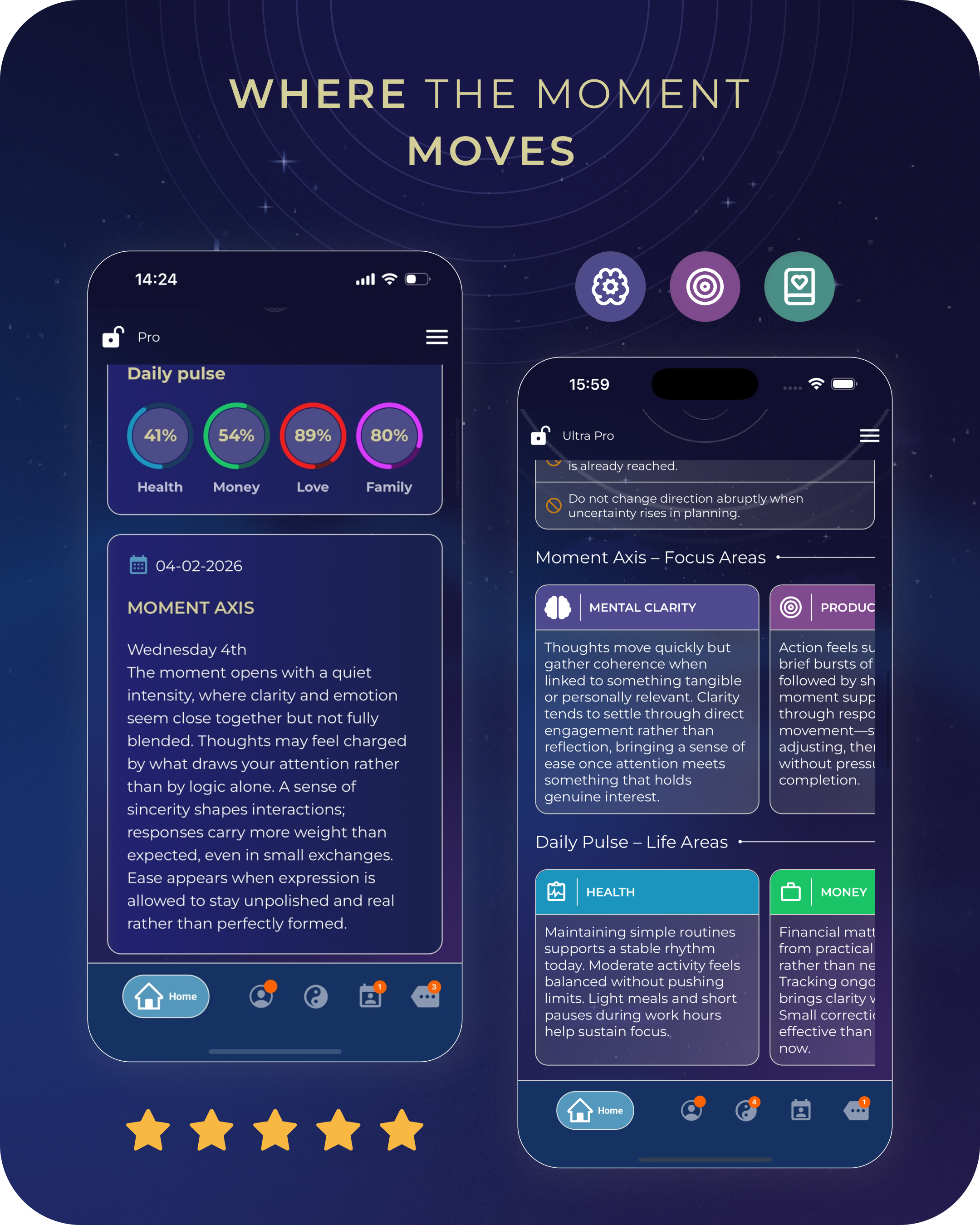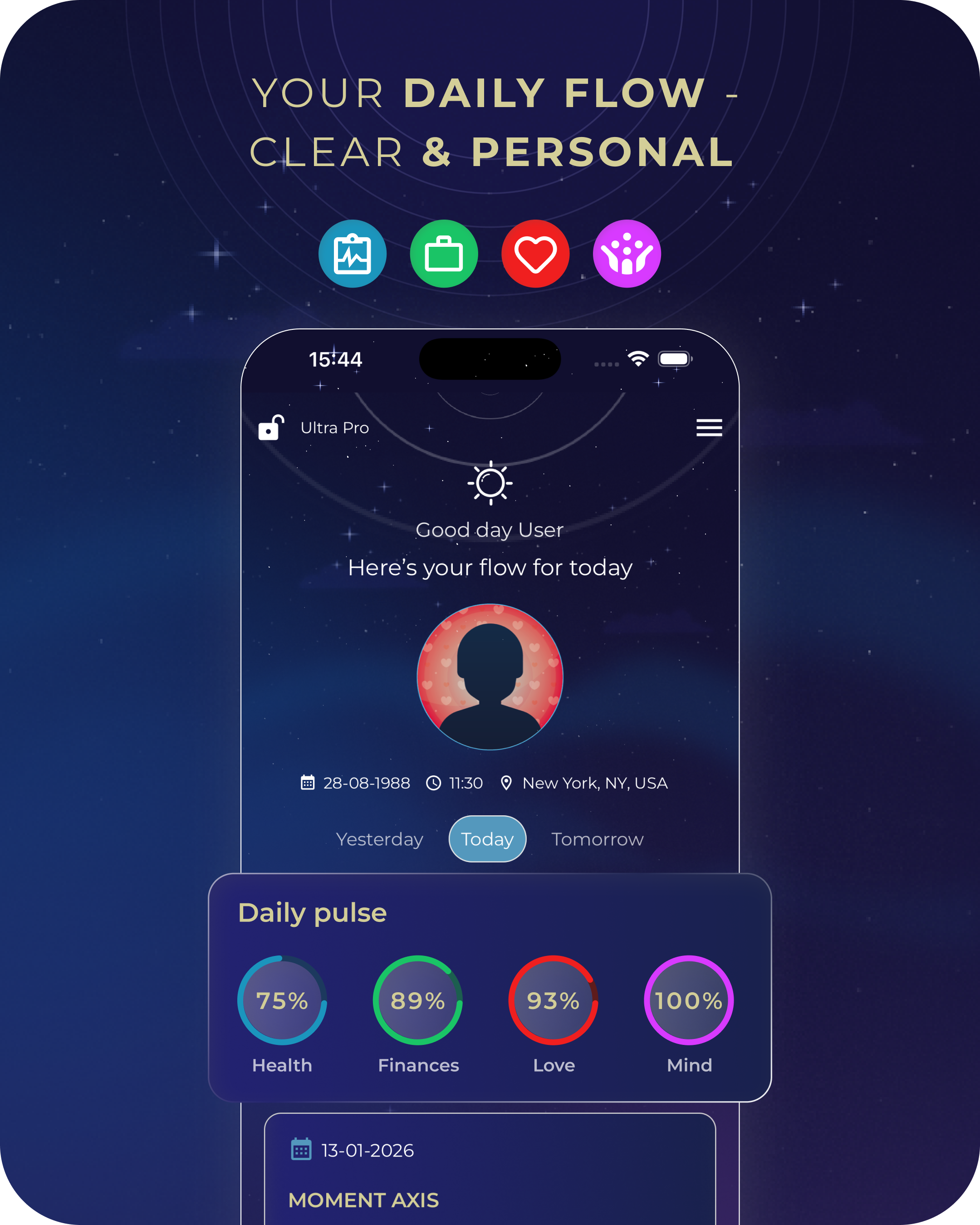 Start with Daily Pulse for a clear view of today’s balance across Health, Money, Love, and Family, including what supports you (Strengths) and what not to force (Pauses). Use Moment Axis to read the atmosphere of the present and adjust your focus and pacing. Go deeper with Your Essence to build a structured map of your natural patterns and talents. Then track real change through Cycles—your Lunar Return (monthly) and Solar Return (yearly)—so timing becomes clearer across weeks and across the year.