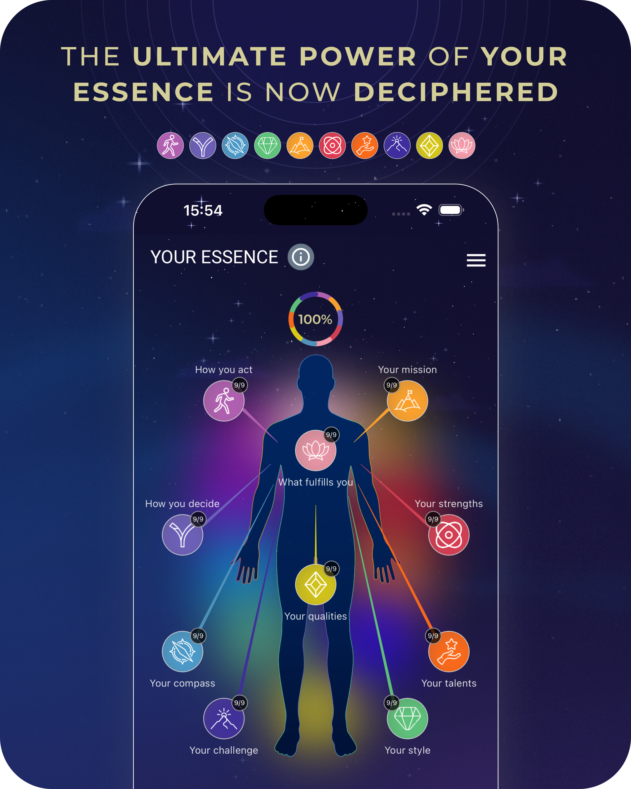 Through Your Essence and Cycles, the app builds a stable personal map of how you operate, decide, and respond under pressure, allowing insight to compound into a coherent system you can return to over time.